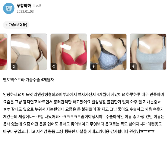 麗延長整形外科 ★★★★★ 5.0 [강남언니] 가슴성형(멘토) / 4개월차/ 닉네임:푸항하하 匿***@ | 2022.01.11 | 20 리엔장성형외과에서 수술 받은 후 강남언니에 업로드한 실제 후기입니다. 수술항목: 가슴성형(멘토엑스트라) 返回評價列表