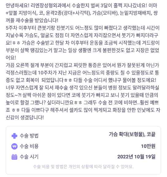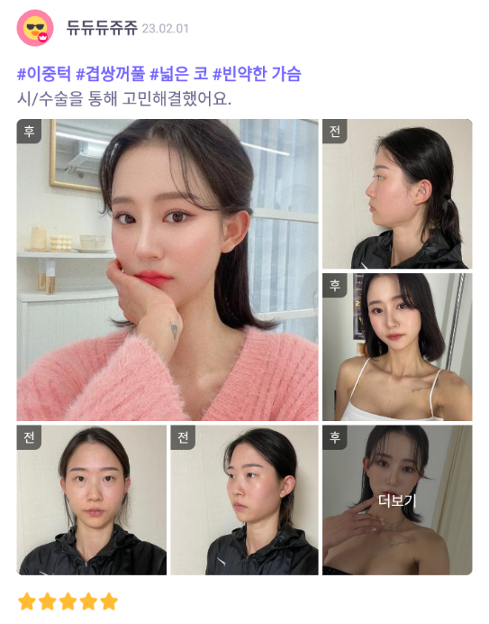 麗延長整形外科 ★★★★★ 5.0 [바비톡] 눈재수술, 눈밑지방재배치, 코, 윤곽2종(광대, 사각턱), 가슴(모티바), 지방이식(이마, 앞볼) / 3개월차 /닉네임: 듀듀듀쥬쥬 匿***@ | 2023.02.13 | 18 返回評價列表