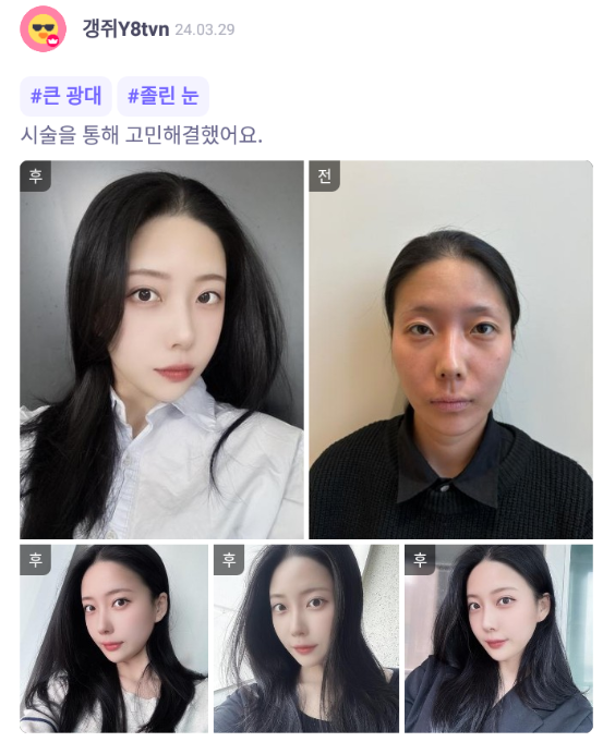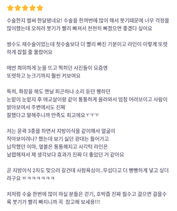 麗延長整形外科 ★★★★★ 5.0 [바비톡] 윤곽3종, 눈매교정, 쌍꺼풀절개, 눈밑지방재배치, 지방이식(볼, 이마) / 1개월차 / 닉네임: 갱쥐Y8tvn 匿***@ | 2024.08.29 | 16 返回評價列表