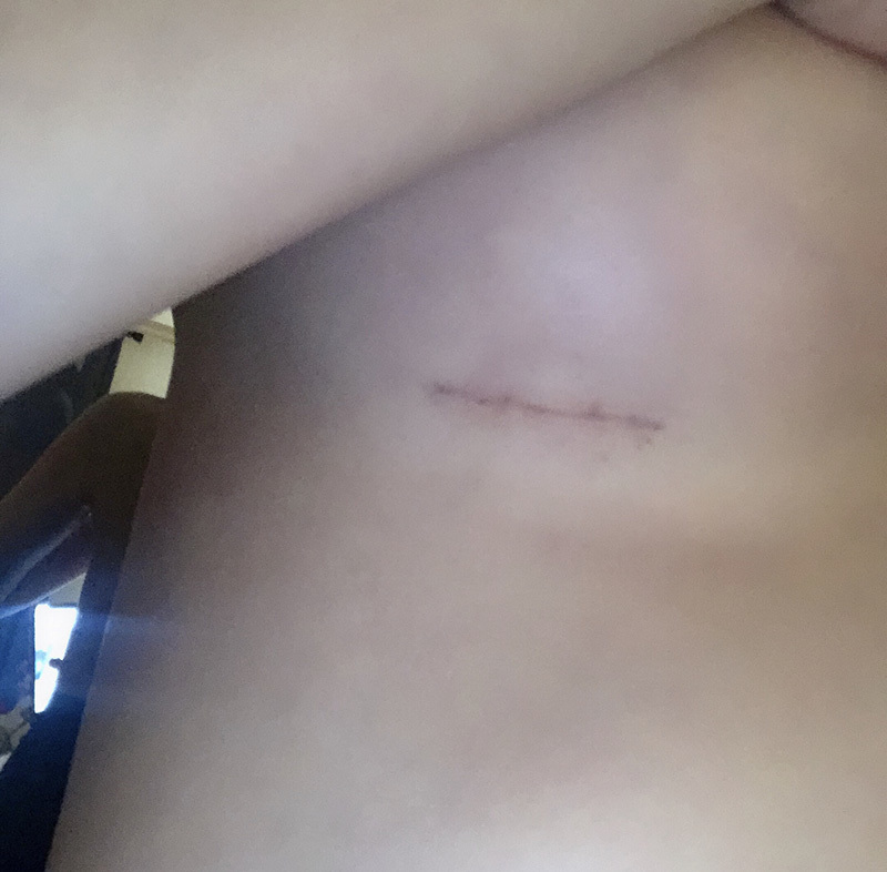 傷口部位不是縫合的,而是用膠水黏合的,所以現在感覺恢復得非常快!? 現在膠水都掉了,只剩下痂,但為了預防留下疤痕,從今天開始塗抹除疤藥膏。